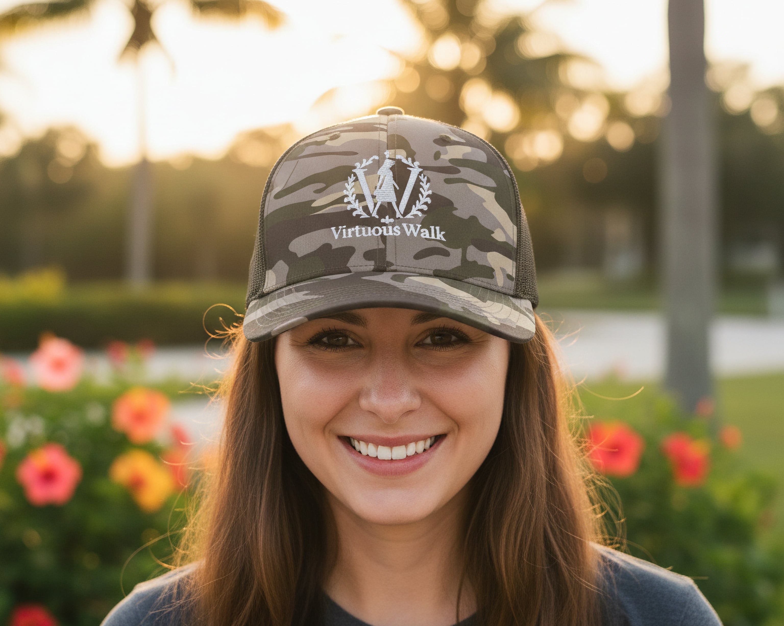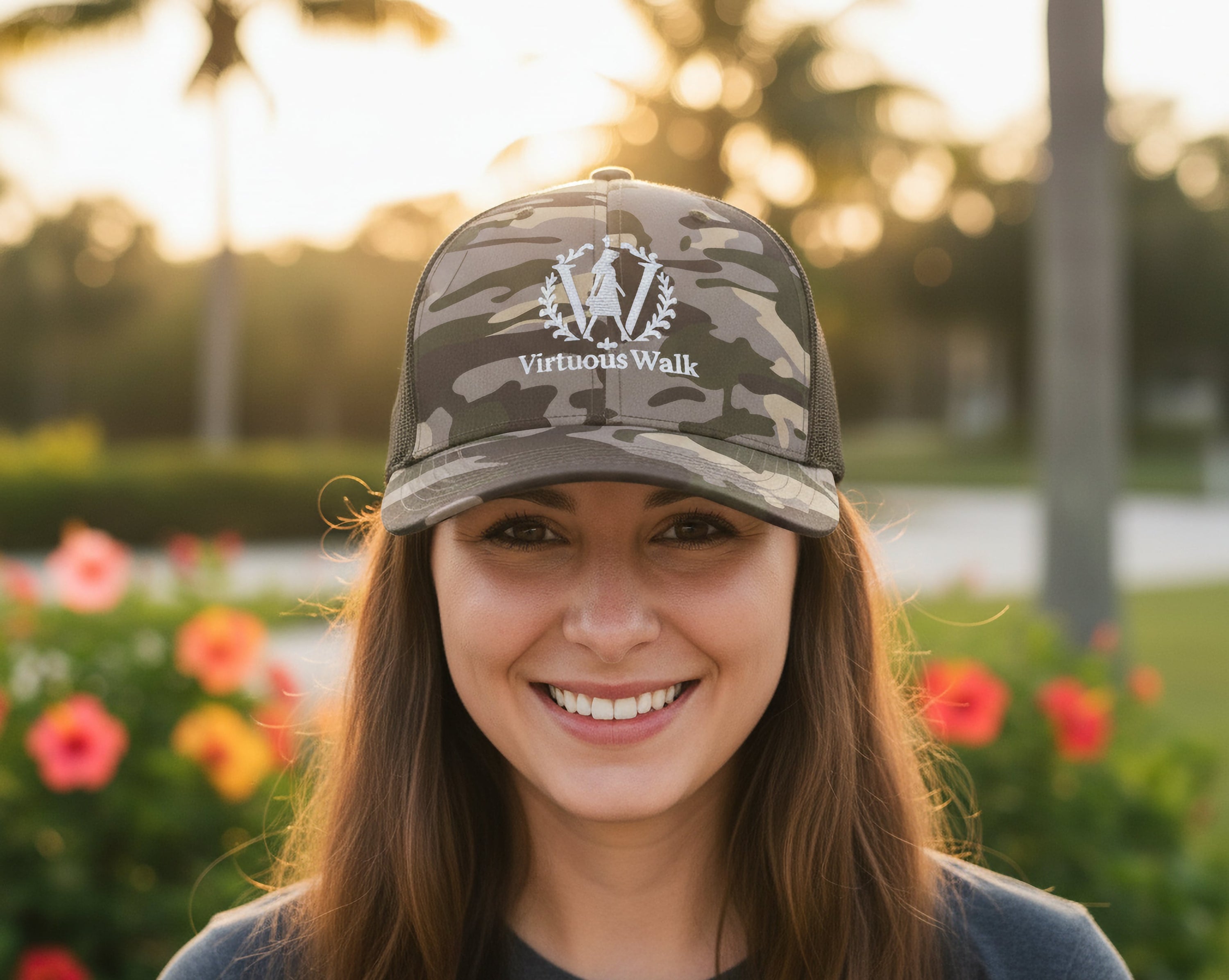 Faith and function come together in this embroidered camouflage hat featuring the Virtuous Walk logo front and center. Built with a structured fit, breathable mesh back, and adjustable snap closure, it’s ready for everyday wear. The camo design makes a bold style statement, while the logo embroidery reminds you to walk with virtue in every step. Perfect for outdoor adventures or casual days on the go.
